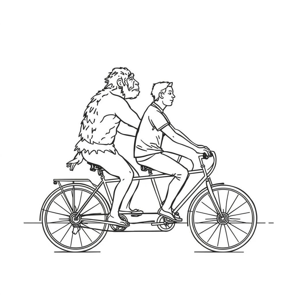 Stell dir vor, in deinem Kopf sitzen zwei „Fahrer“. Der eine ist der Neandertaler in uns: Er wohnt bildlich gesprochen im älteren Teil unseres Gehirns, im Stammhirn. Er denkt nicht lange nach, er will vor allem überleben: kämpfen, fliehen, erstarren. Er reagiert auf Gefahr, Stress und Bedrohung – egal, ob es ein wütender Chef, ein voller Terminkalender oder eine kritische Bemerkung ist. Dieser innere Neandertaler ist schnell, laut und impulsiv.